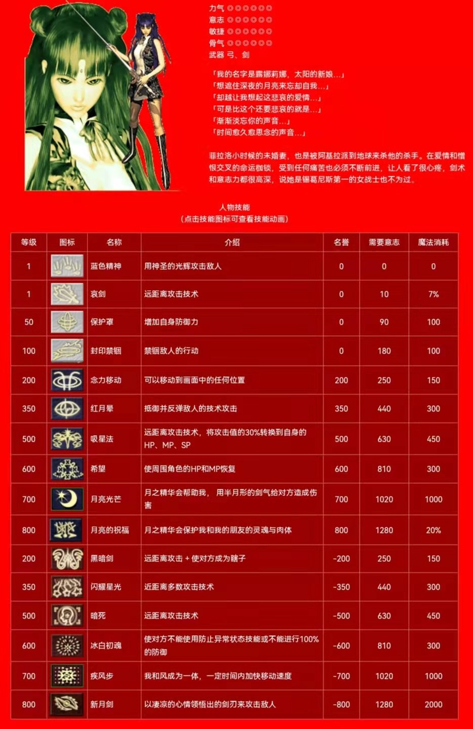 露 群攻技能 白名:哀剑(1级) 红名:闪耀星光(350级)新月剑(800级)